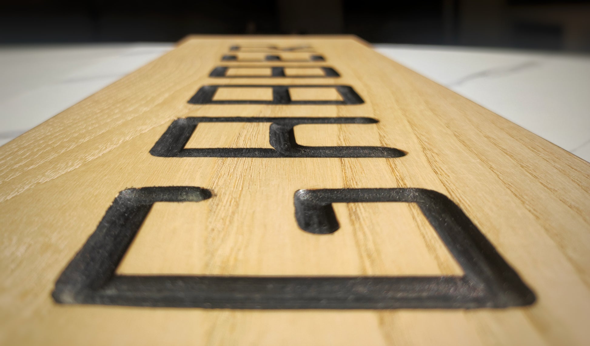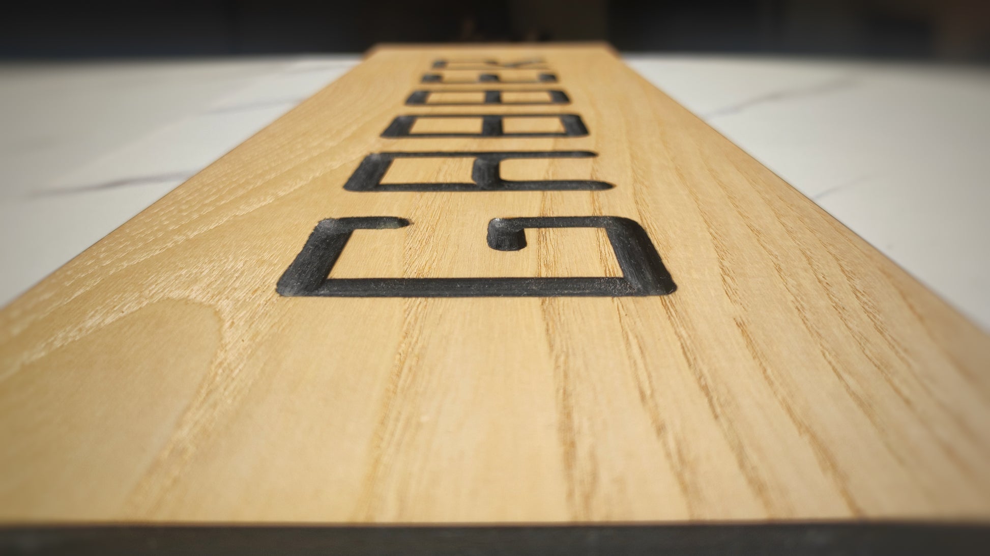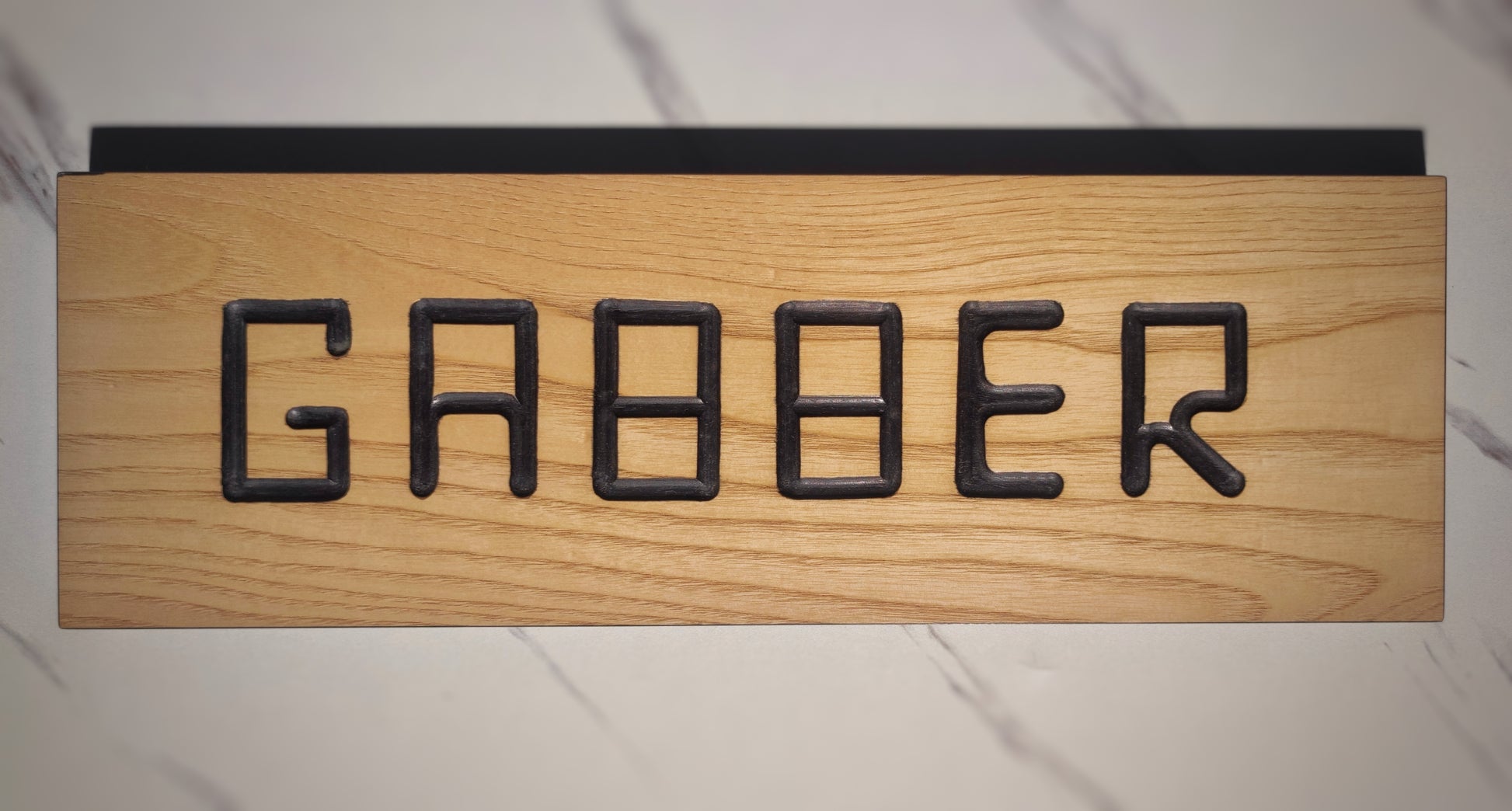 Gravé à la défonceuse, le mot Gabber s'impose sur un panneau en contreplaqué plaqué plaqué en frêne , souligné par des chants en ébène de Macassar pour une finition brute mais élégante.