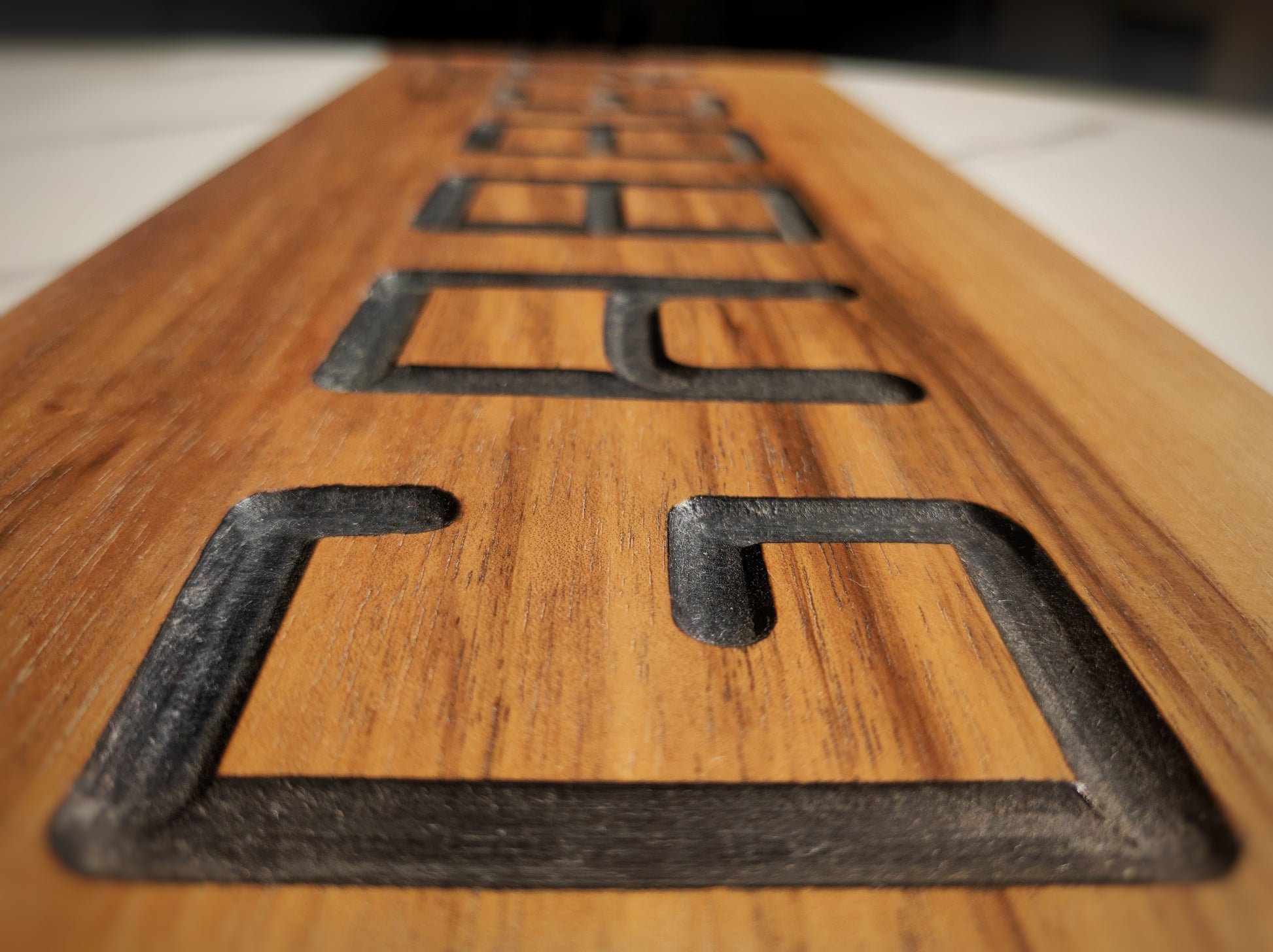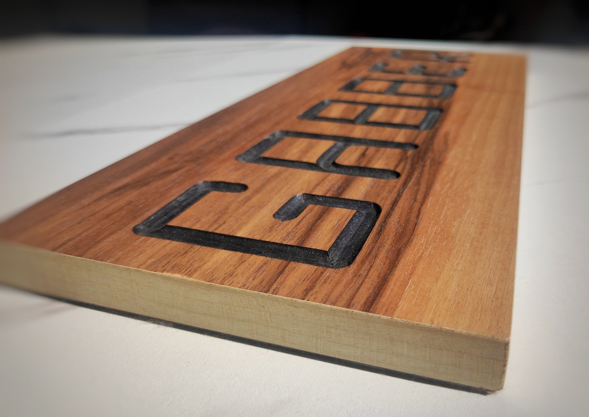 Gravé à la défonceuse, le mot Gabber s'impose sur un panneau en contreplaqué plaqué plaqué en noir français , souligné par des chants en érable pour une finition brute mais élégante.