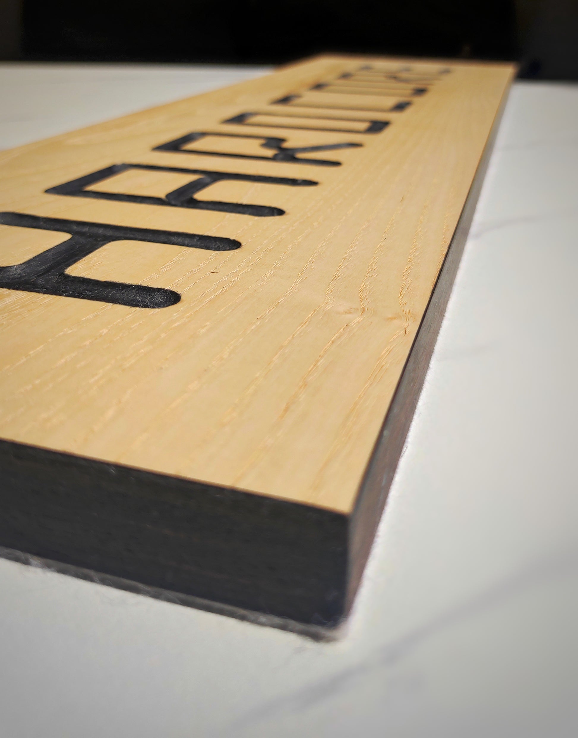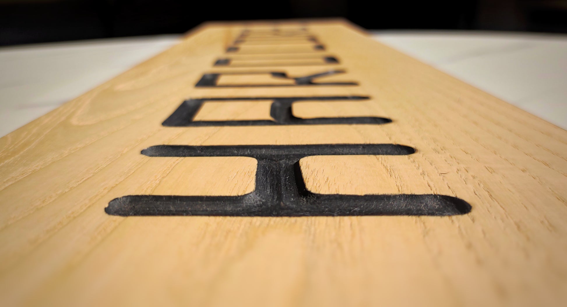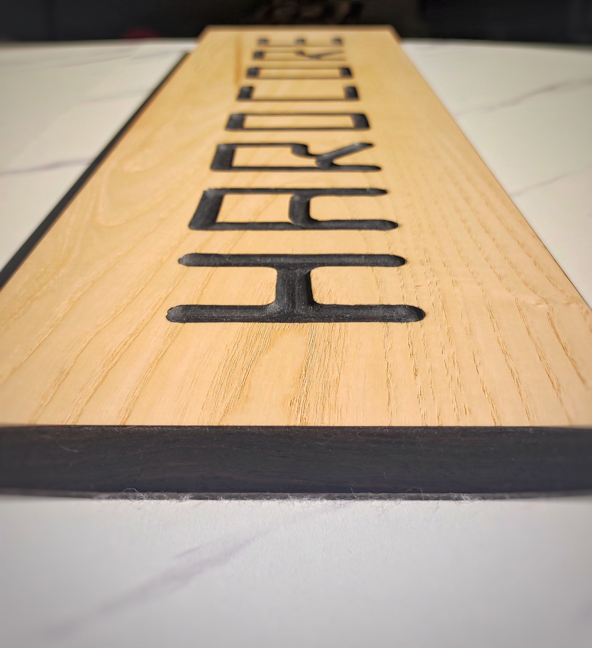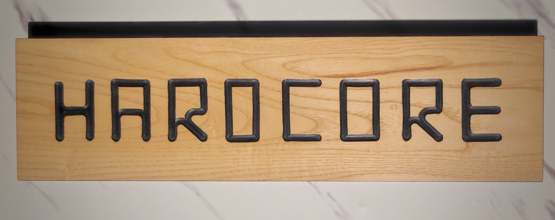 Gravé à la défonceuse, le mot HARDCORE s’impose sur un panneau en contreplaqué plaqué plaqué en frêne, souligné par des chants en ébène de Macassar pour une finition brute mais élégante.