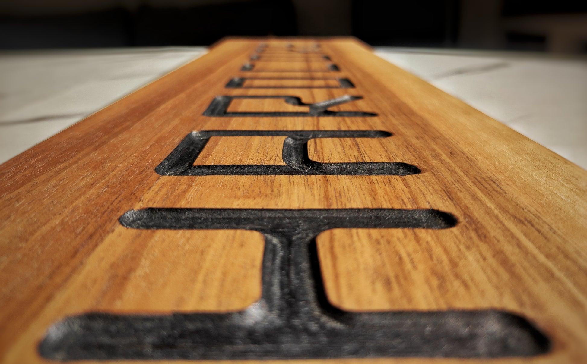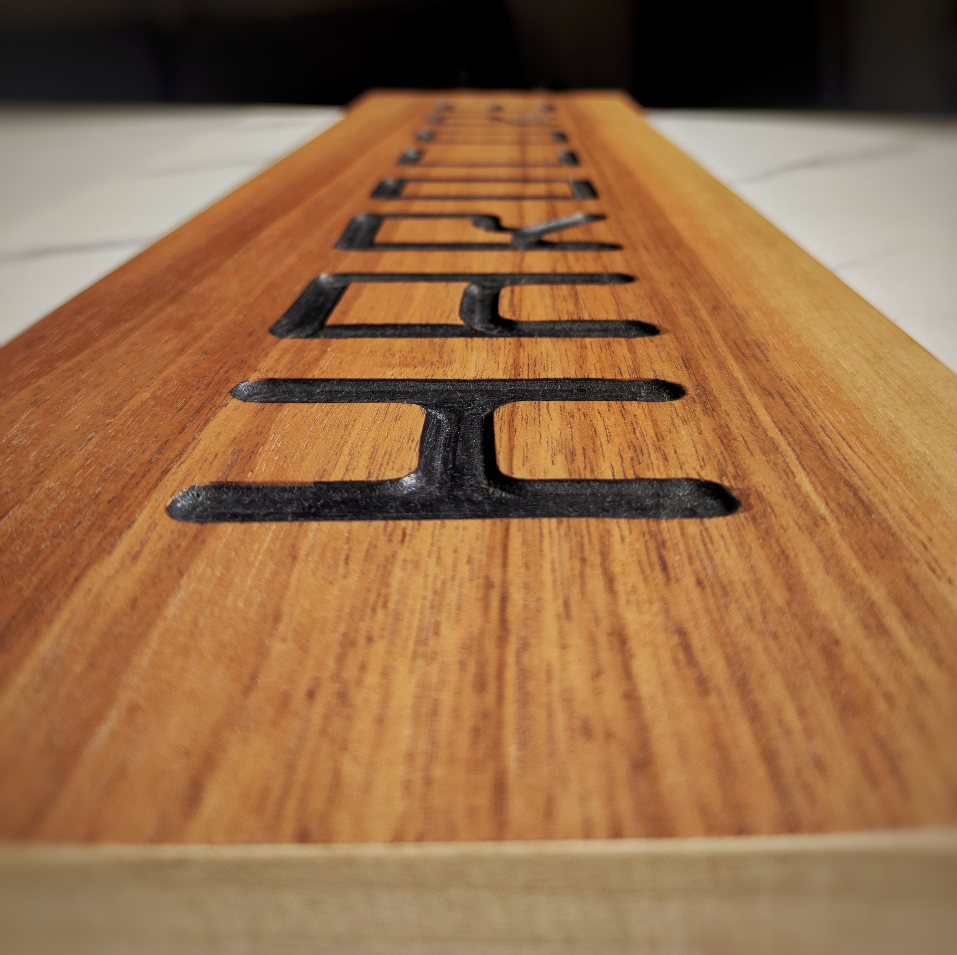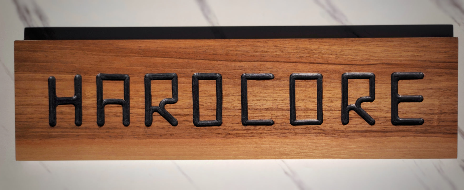 Gravé à la défonceuse, le mot HARDCORE s’impose sur un panneau en contreplaqué plaqué plaqué en noyer Français, souligné par des chants en érable pour une finition brute mais élégante.